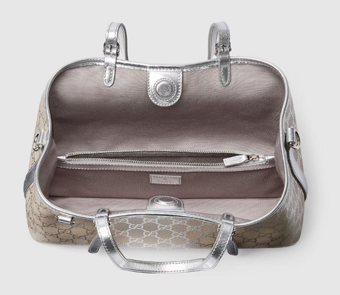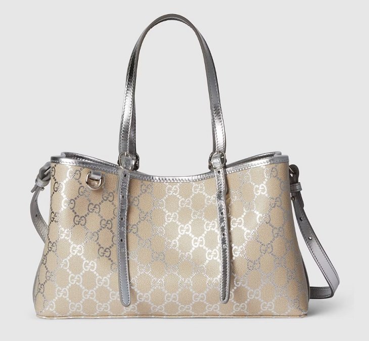 Gucci GG Emblem Small Tote Bag – Beige MetallicSilver